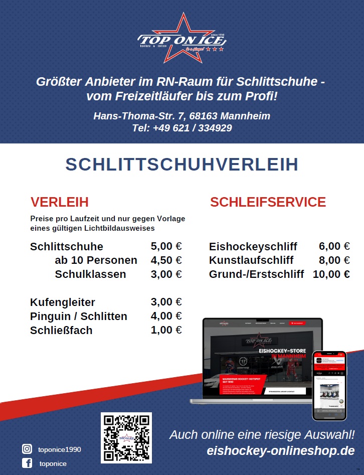Der Schlittschuhverleih im Eisstadion wird vom Eissportshop TOP ON ICE aus Mannheim betrieben. Ihr könnt gegen Vorlage eines Lichtbild-Ausweises moderne Schlittschuhe in allen Größen ausleihen. Nach vorheriger Absprache könnt ihr auch eure eigenen Schlittschuhe schleifen lassen und Eislaufzubehör kaufen. Eine große Auswahl an Schlittschuhen und Eishockeyausrüstungen erhaltet ihr in Mannheim im Hauptgeschäft.